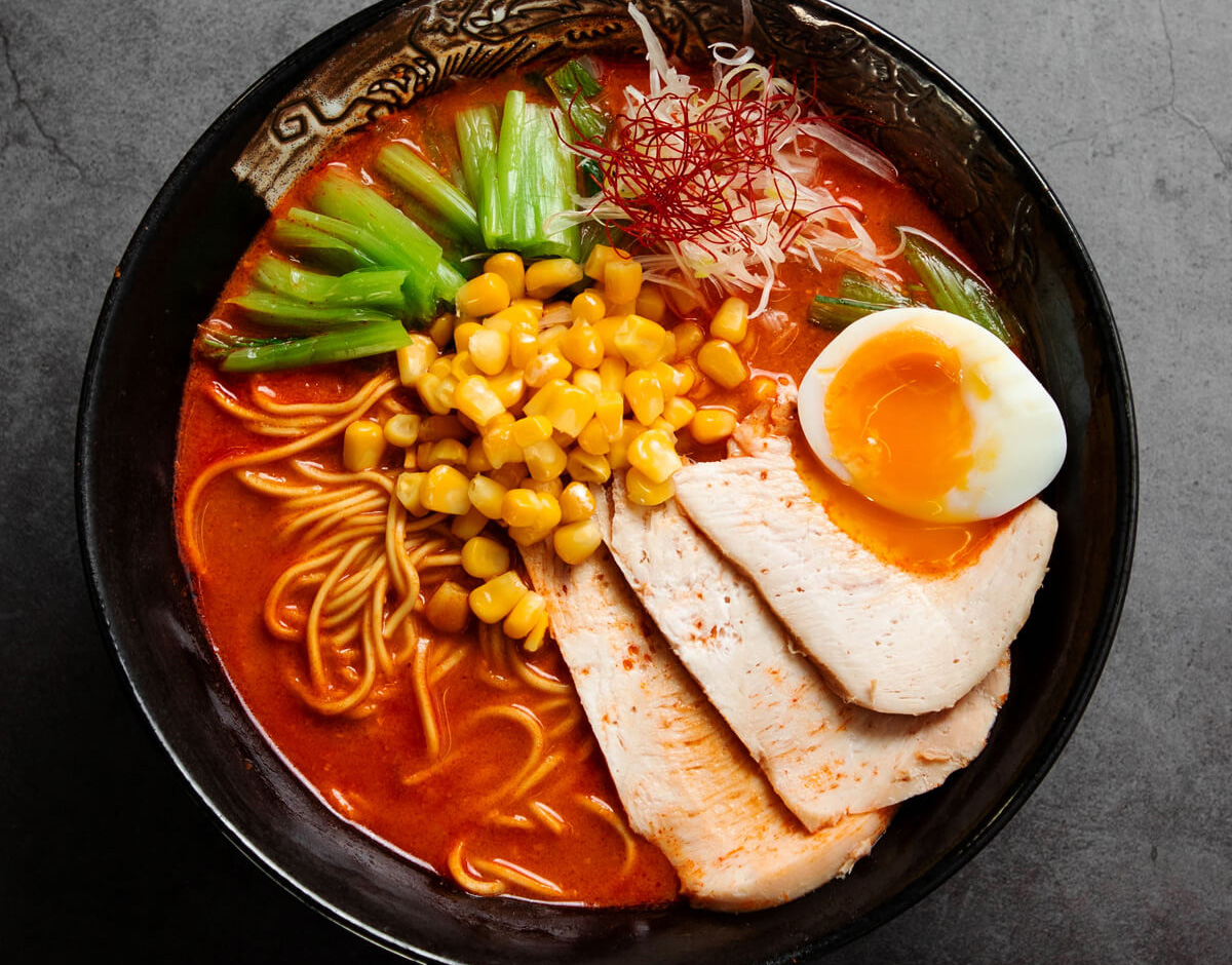 麺が茹で上がりましたら、よくお湯を切って、スープの入った鉢にうつしてお好みの具を盛り付けて出来上がりです。