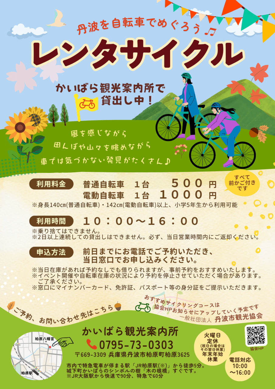 丹波市観光協会 かいばら観光案内所 で貸出し中の レンタサイクルに、新たに ラクラク運転の【電動自転車】が加わりました!