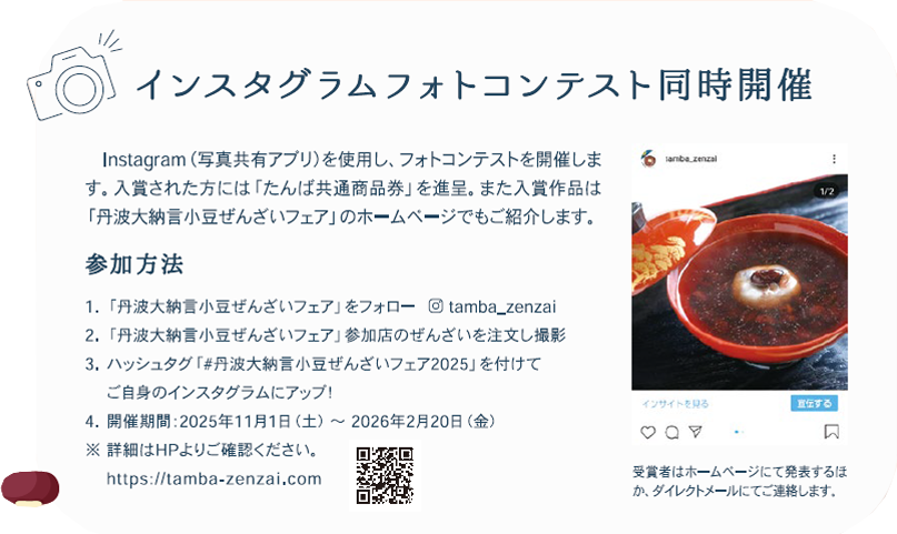 🫘 わくわく🥰: 「ぜんざいフェア」参加店舗でぜんざいを食べて応募出来る、「ぜんざいスタンプラリー」や、「インスタフォトコンテスト」など、楽しみもいっぱい!!
