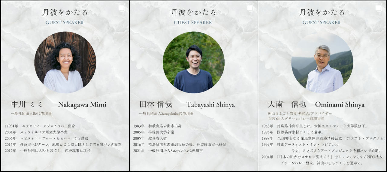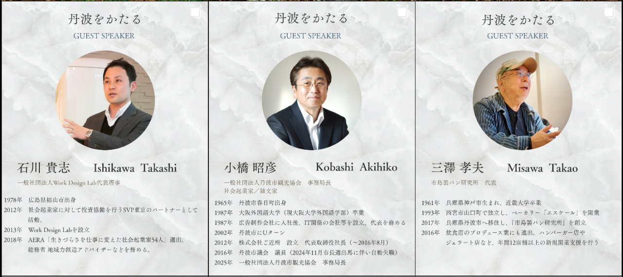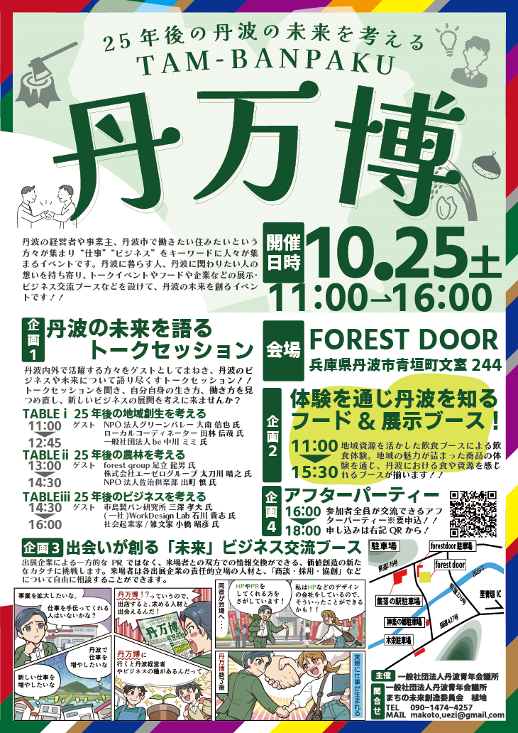 丹波の経営者や事業主、丹波市で働きたい住みたいという方々が集まり “ 仕事 ”  “ ビジネス ” をキーワードに人々が集まるイベントです。 丹波に暮らす人、丹波に関わりたい人の想いを持ち寄り、トークイベントやフードや企業などの展示・ビジネス交流ブースなどを設けます。