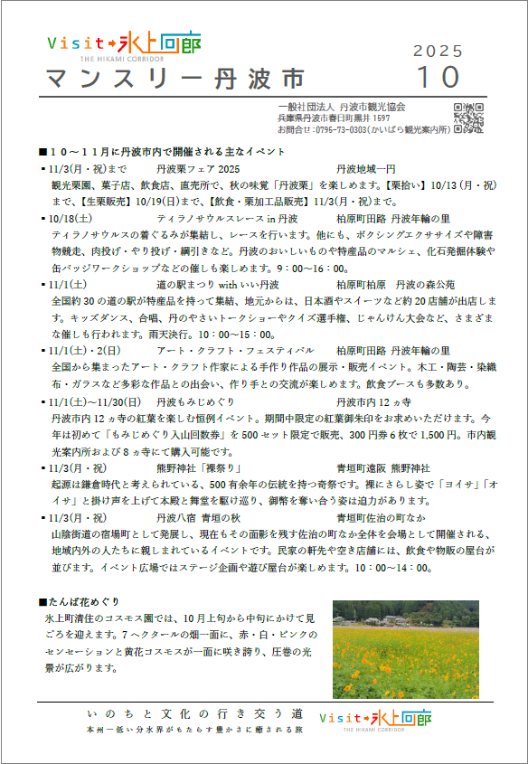 丹波市内のイベントや花の見ごろ情報をまとめた、「マンスリー丹波市10月号」を発行いたしました。