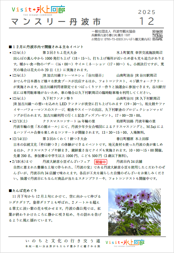 丹波市内のイベントや花の見ごろ情報をまとめた、「マンスリー丹波市12月号」を発行いたしました。