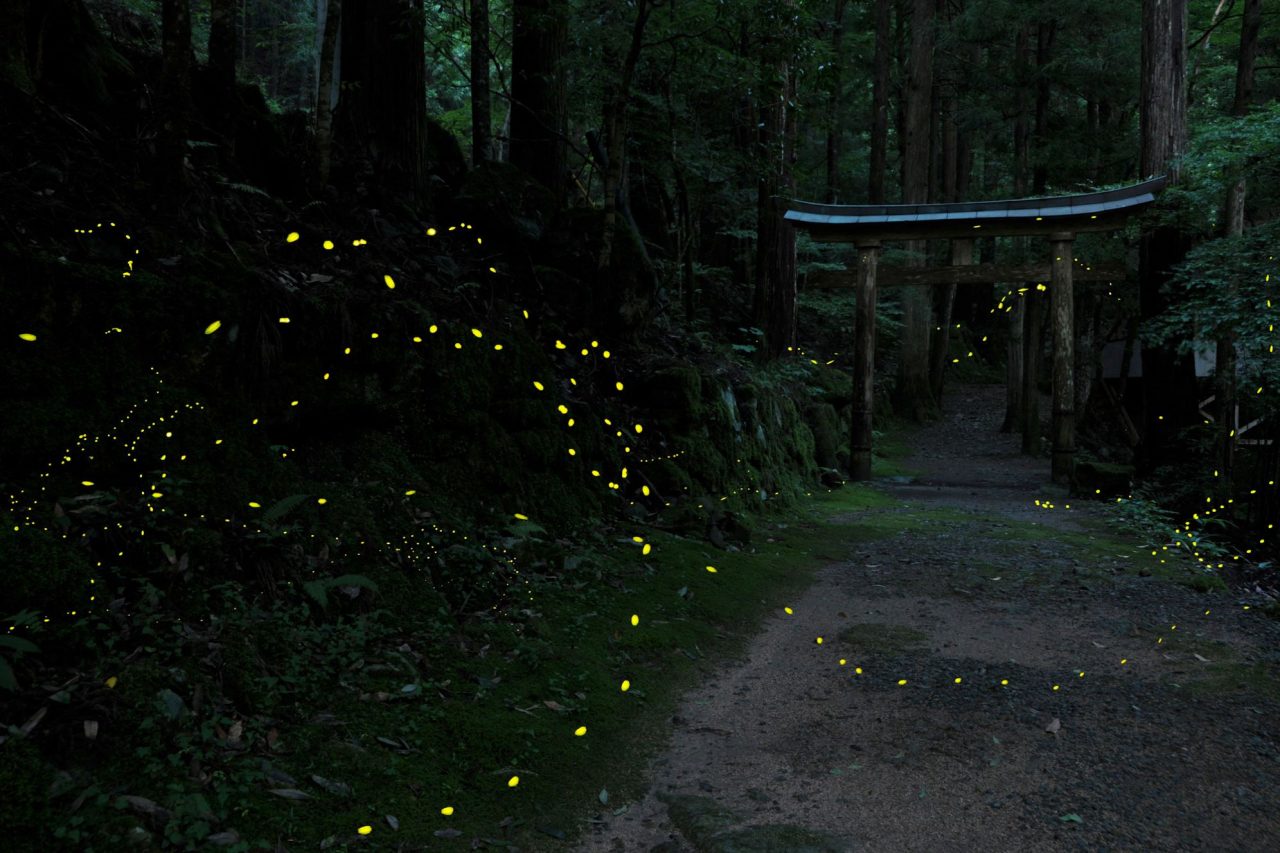 山側にヒメボタル、渓流側に源氏ボタルが飛び交い、光の共演の大パノラマ観ているようである。